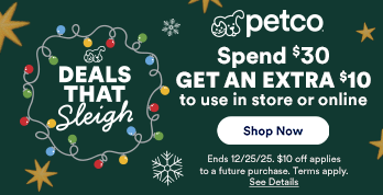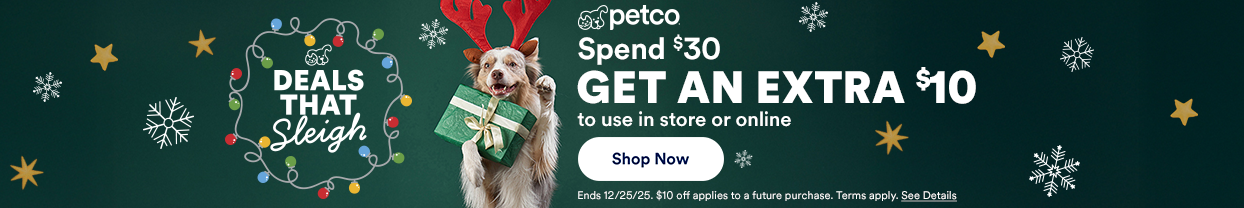 From 12/12/25-12/25/25, spend $30 online at petco.com or in-store at Petco or Unleashed by Petco and receive a $10 coupon for a future purchase. Limit of one coupon will be issued per customer per day. Must be a Vital Care member to receive offer. No rain checks or substitutions will be permitted. Not valid on Pretty Litter, RX Brands, grooming, self-wash, training, pharmacy, vet services, out-of-stock items, prior purchases, donations, gift card purchases, Vital Care Premier membership purchases or membership fees. Petco reserves the right to discontinue this offer at any time without notice.