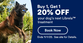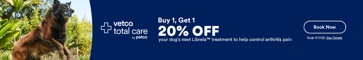 This offer entitles any pet parent to 20% off the purchase of the second Librela® injection for one pet, as recommended and prescribed by your Vetco Total Care veterinarian. The first Librela® injection must be completed during the promotion period to receive the 20% discount on the second injection. Cannot be combined with any other offers. A Vetco Total Care veterinarian must complete an exam and diagnose your pet before making a recommendation on a solution. Fees will apply for any additional services, including comprehensive exam, diagnostic testing, treatment, vaccinations, medications, and/or disposal of medical waste. Valid only at participating Vetco Total Care full-service animal hospital locations at Petco and Petco-owned acquired standalone locations. Purchases made outside of the promotion period are not eligible. Must book appointment. Pet parents must be 18 years or older. No cash value. Not valid at mobile Vetco Vaccination Clinics. Void where prohibited by law. Expires 11/29/25. Librela Indications: Librela is indicated for the control of pain associated with osteoarthritis in dogs. See full Librela Prescribing Information.